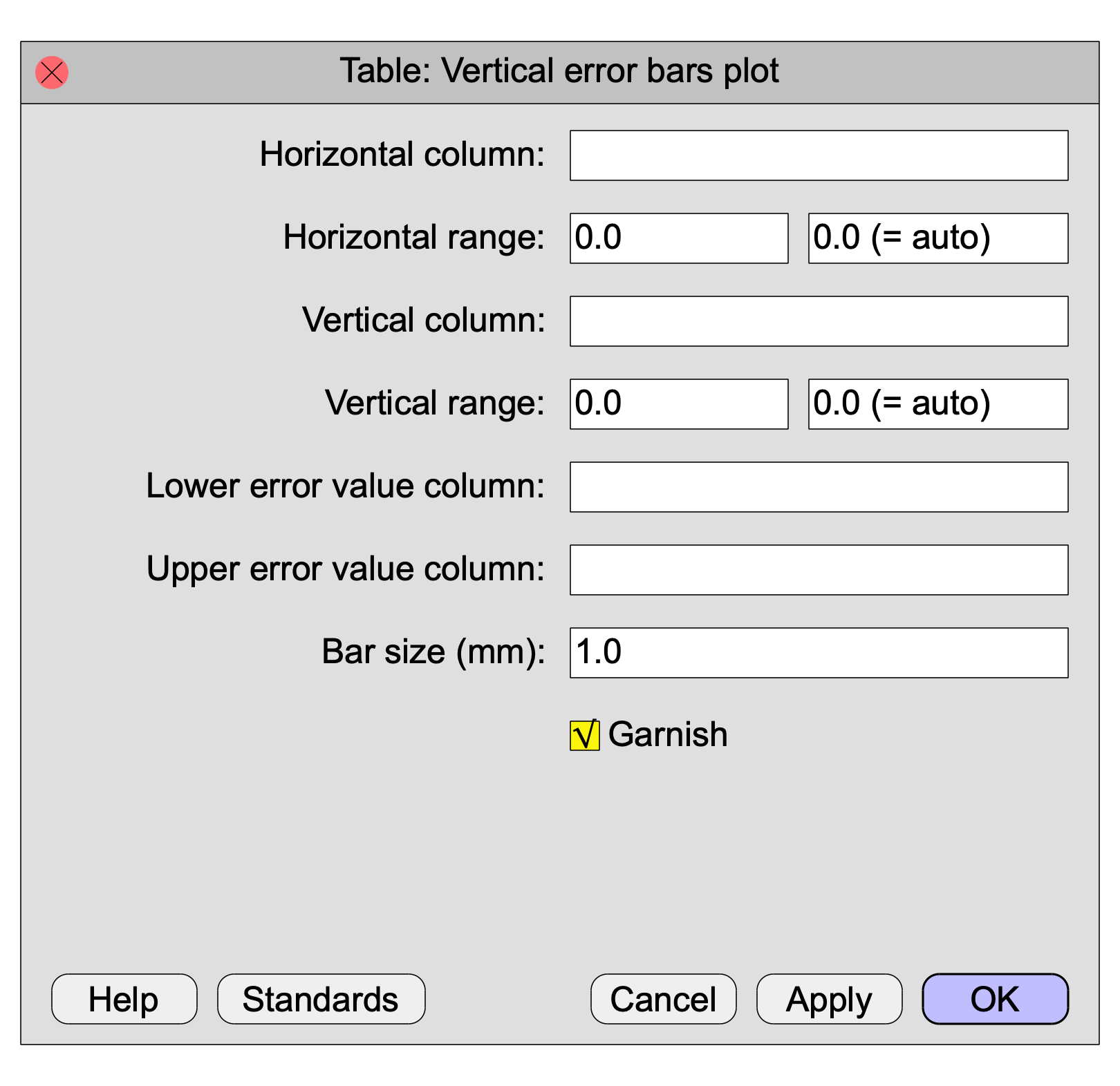 - determine the size of the vertical lines that will be drawn. These lines are drawn between the points (x,y-low) and (x, y+up), where x and y are the values from the horizontal column and the vertical column, respectively, and, low and up are the corresponding values in the lower error value column and the upper error value column, respectively. If either of these column names is not given the corresponding values (low and/or up) will taken as zero. This makes it possible to draw one-sided and two-sided error bars. If your errors are symmetric around the y-position, your table only needs one column and you can supply the name of this column in both fields.