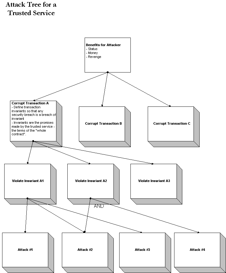 Bruce Schneier has developed a methodology called "attack trees" for analyzing and designing security. These are described in Chapter 21 of his new book, _Secrets and Lies_, and also the Dr. Dobbs article on attack trees. This author has invented a methodology, for using attack trees to analyze the controls needed to implement trusted services.